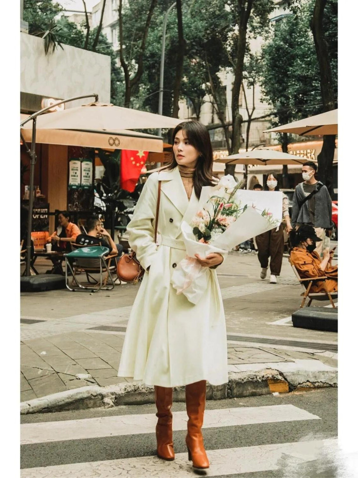 白色风衣+焦糖色长筒靴,简约时髦又洋气!
